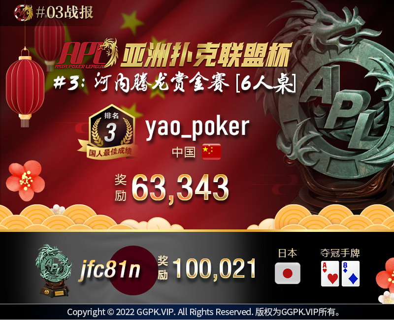 APL#3: 河内腾龙赏金赛[6人桌]由日本玩家 jfc81n 夺冠,中国常胜军yao_poker则获得第3名,斩获63,343人民币奖励,再显实力!