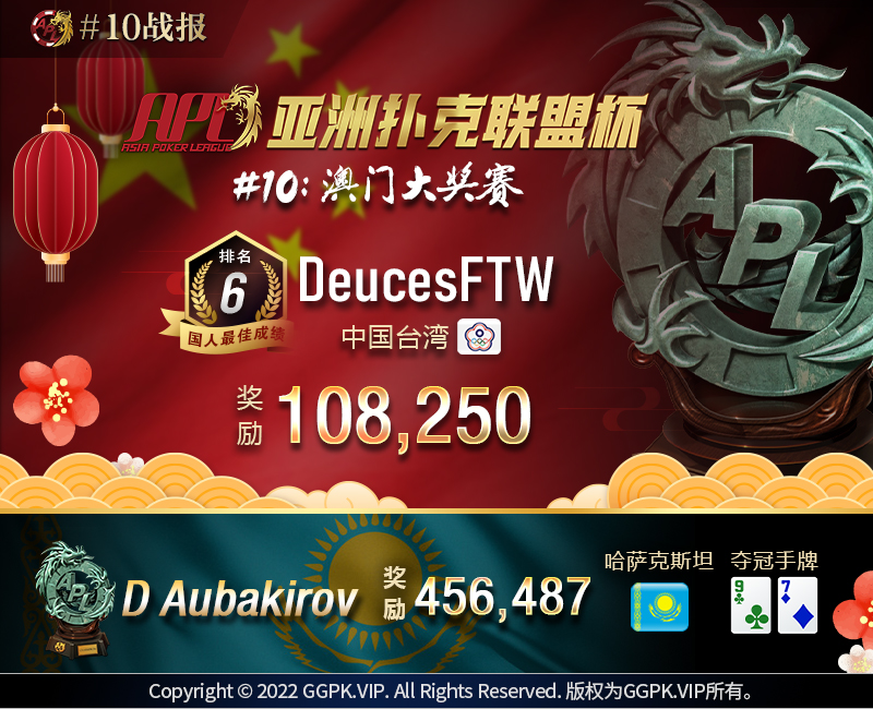 APL#10: 澳门大奖赛由哈萨克斯坦玩家 D Aubakirov 夺冠,中国台湾玩家DeucesFTW 则名列前茅获得第6名,成为本场国人最佳成绩。