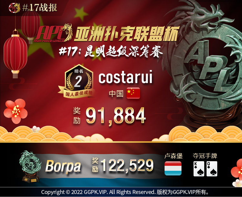 2022 年 2 月 15 日 #赛事战报2022-1 2022 APL新春系列赛#17 赛事战报 APL#17: 昆明超级深筹赛 国人costarui夺得亚军,获得91,884奖励。冠军由卢森堡玩家 Borpa 夺下,斩获122,529奖励。 详细资讯请至:http://aplpuke.com