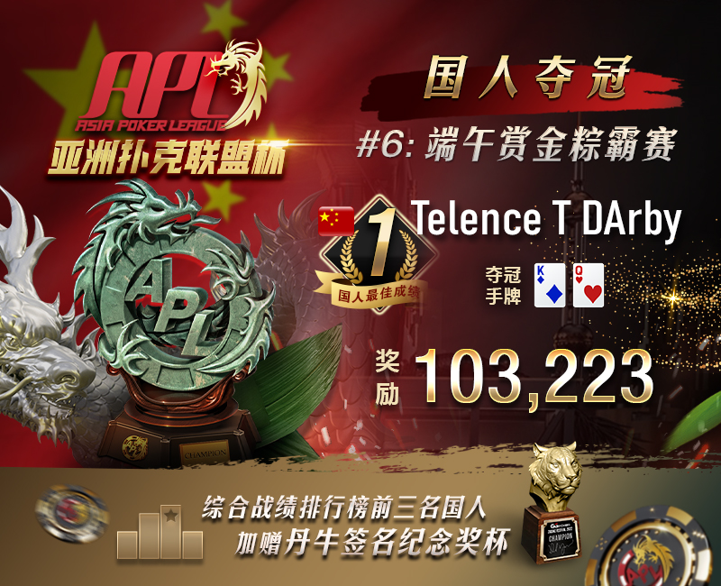 这一场赛事多位国人再度涌入决赛桌,盛况当前,Telence T DArby独占鳌头带走103,223元冠军奖励,为中国夺下本届APL第三座玉制龙形奖杯,尽显龙的传人之实力!