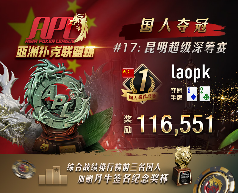 第5座APL玉制龙型奖杯入袋!国人玩家laopk成功登上APL#17: 昆明超级深筹赛冠军宝座,获得了116,551元奖励!